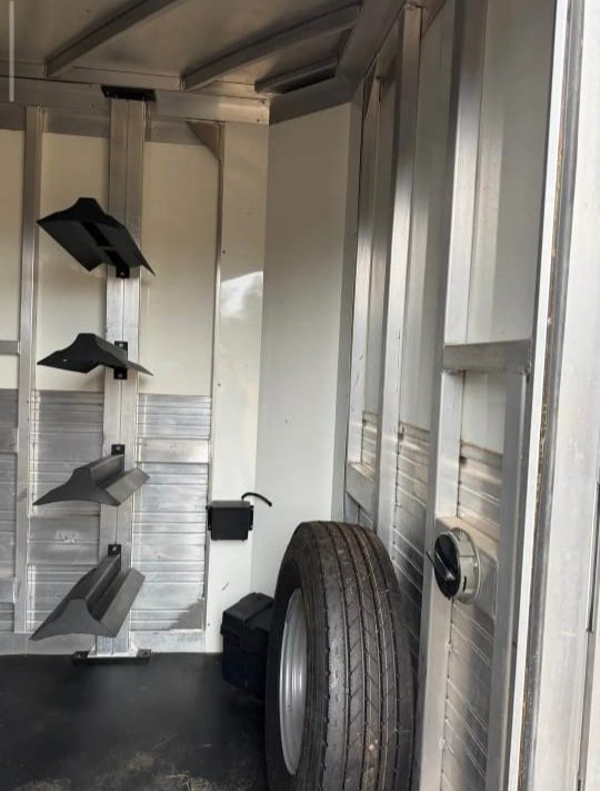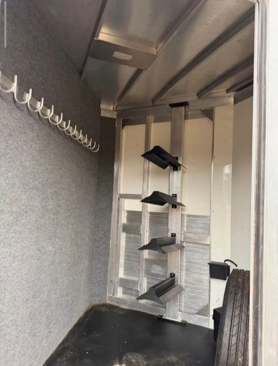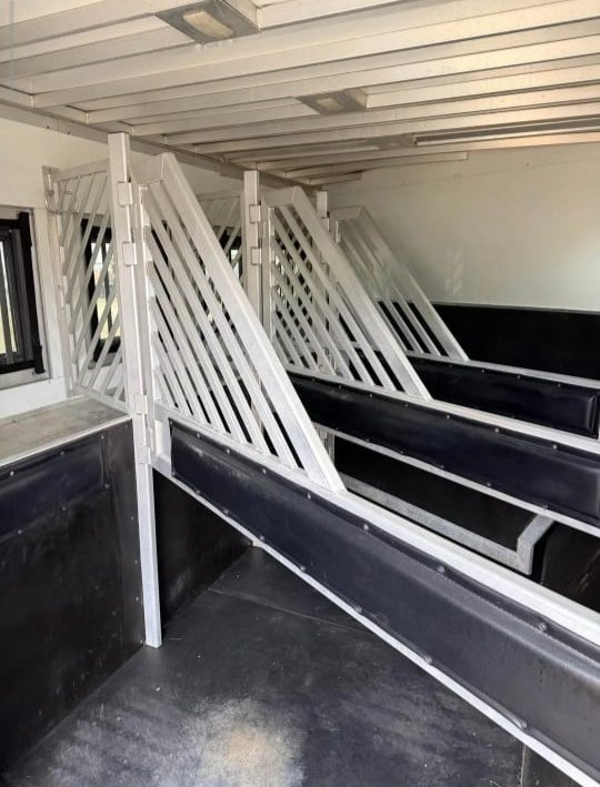 It’s all aluminum roof, floor, sides and frame so it’s strong without being overly heavy. The wedge nose gives it a clean look and better pull and the integrated hay pod is a really nice bonus for extra storage. The lower aluminum slats were just polished and it’s sitting on brand new matching 14 ply tires, so it both looks good and is road ready.