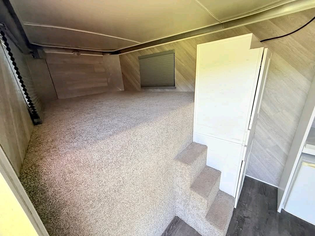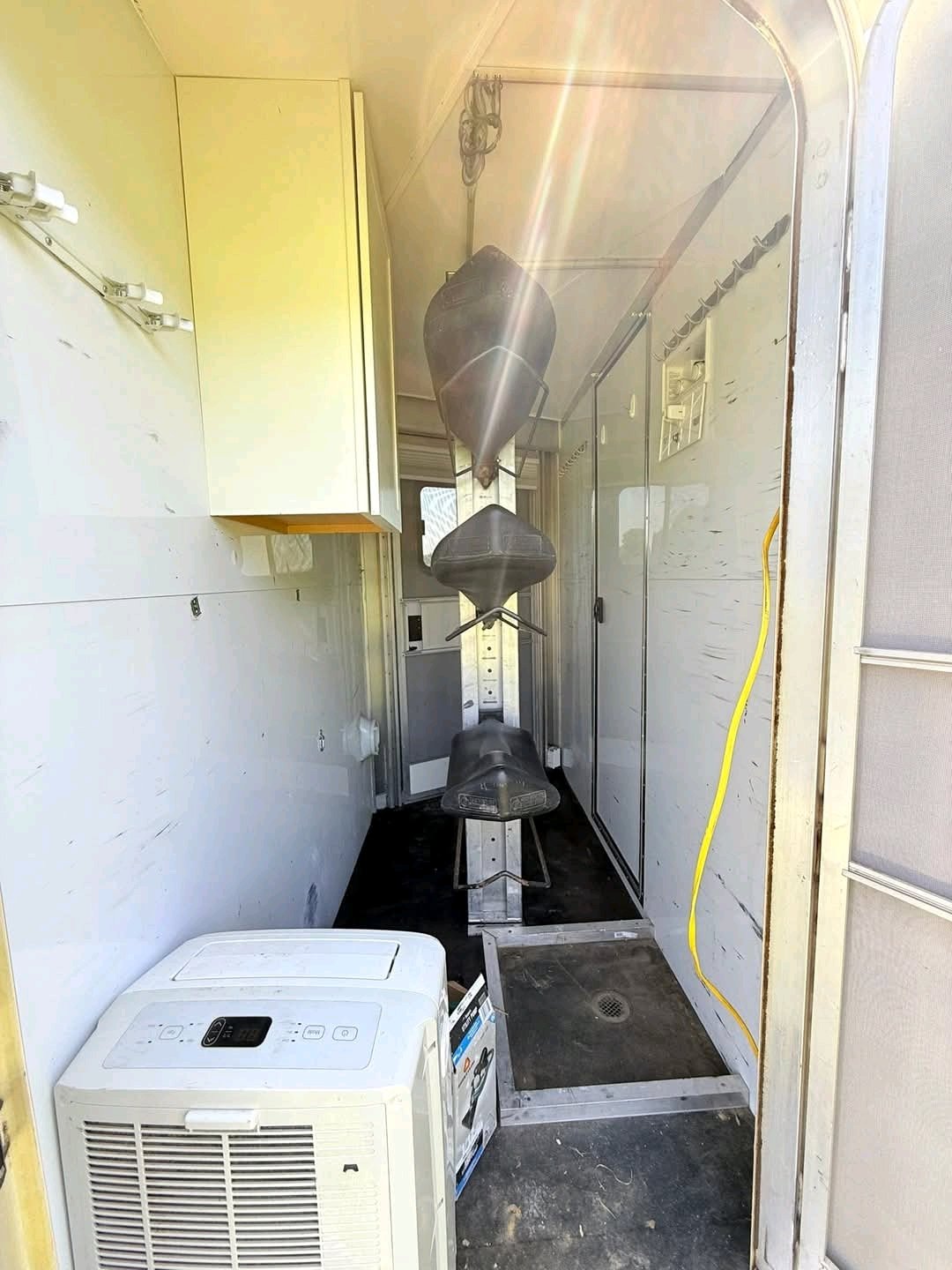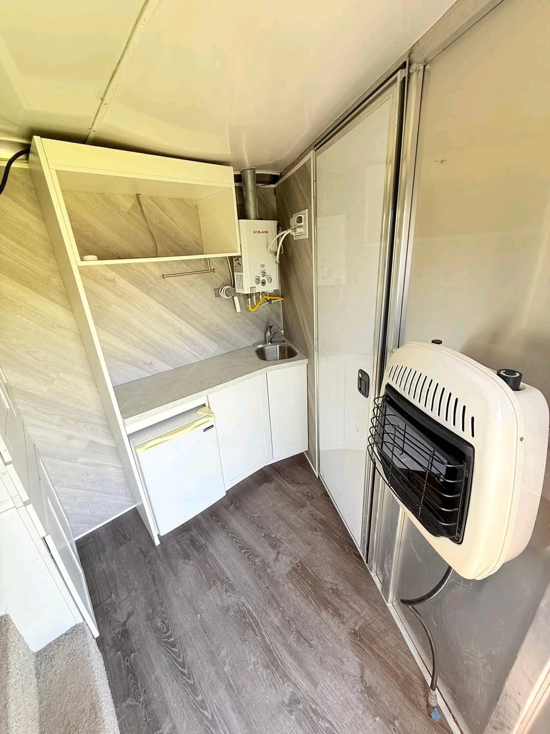 Up front, the weekender area is simple but functional, offering a sink setup, plenty of cabinetry, a portable AC unit that vents into the rear, and a propane wall heater to keep things comfortable in any season.