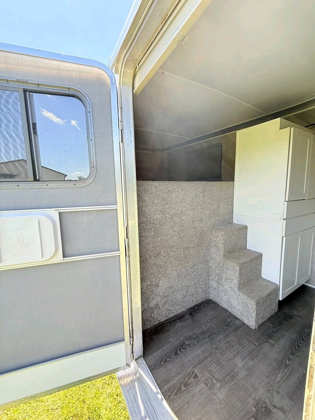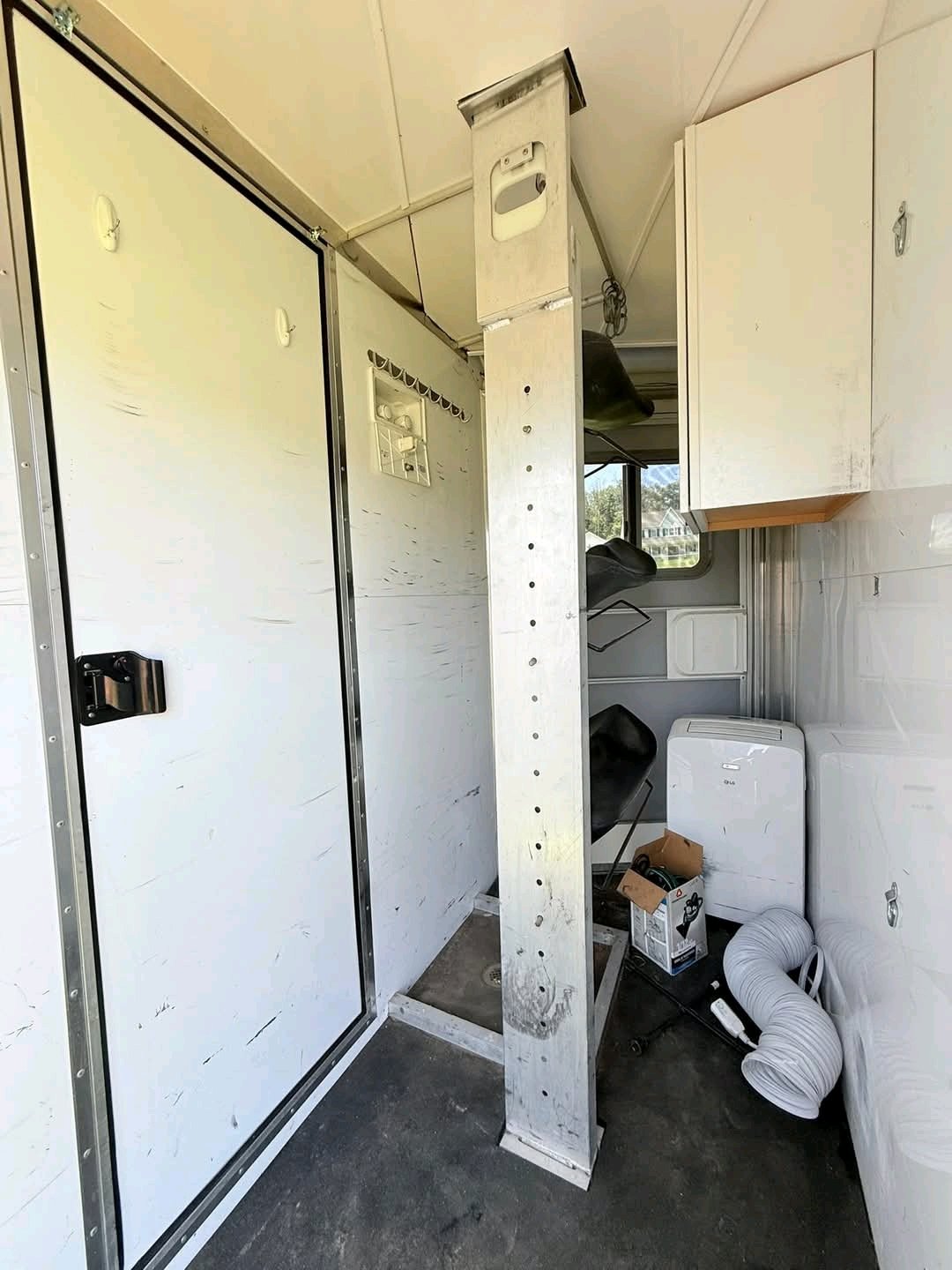 The trailer features a mid tack room with movable saddle racks (can be relocated to the rear tack), bridle hooks and additional storage space. There’s also a convenient shower setup with curtain, shower head, and an Insta Hot water heater located in the front area, perfect for quick cleanups after a long day.