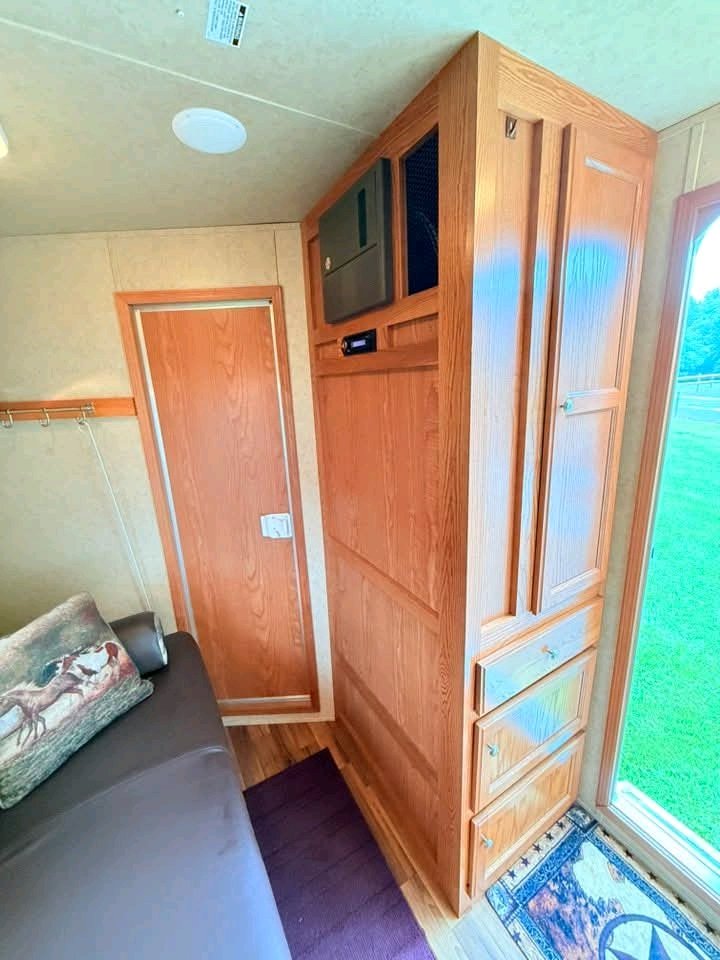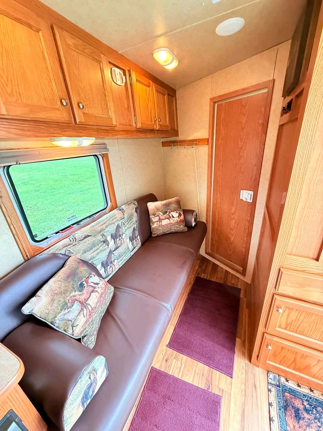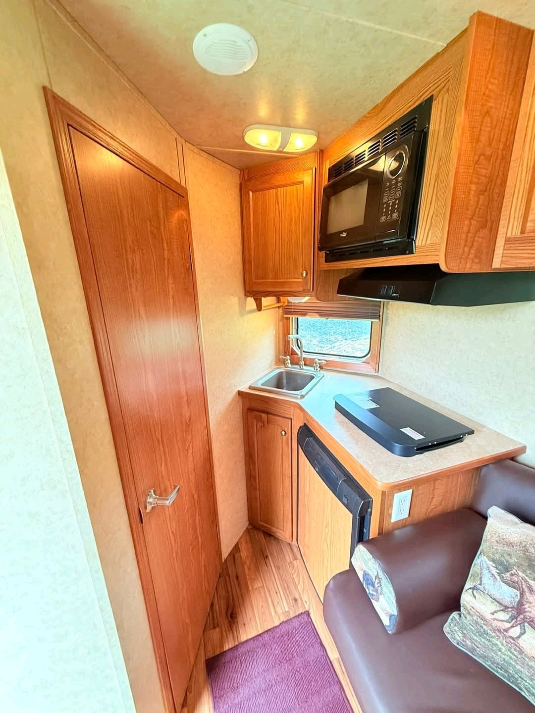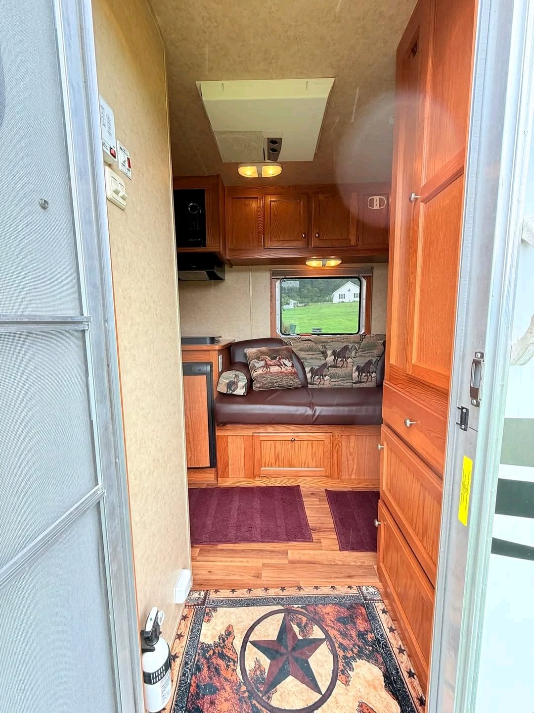 The trailer is equipped with an electric jack, 2 batteries, 2 propane tanks, 4 brand new tires and a spare tire. The living quarters include an awning, 2 burner stove with fan, refrigerator, sink, microwave, air conditioner with heat strip, sofa/bed and a bathroom with shower and toilet.