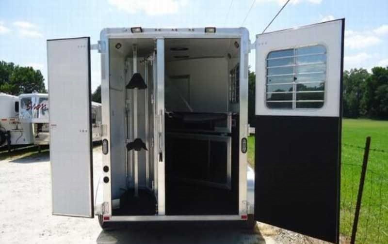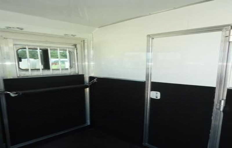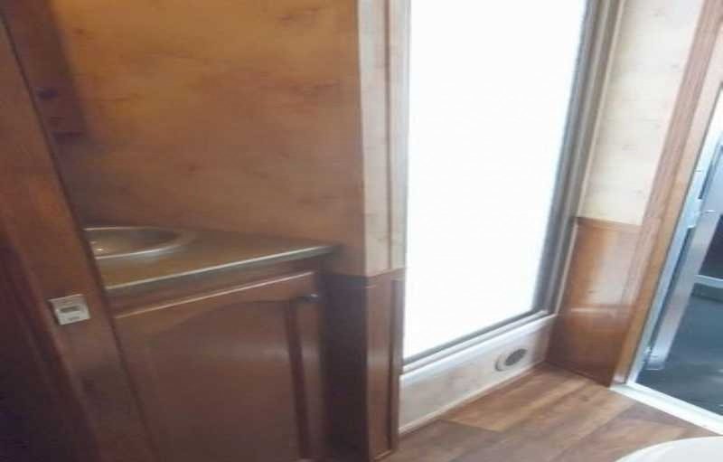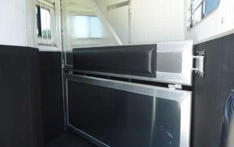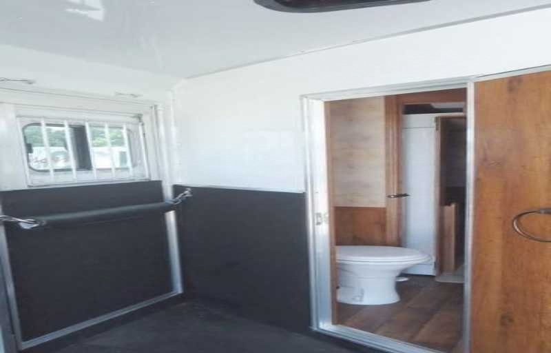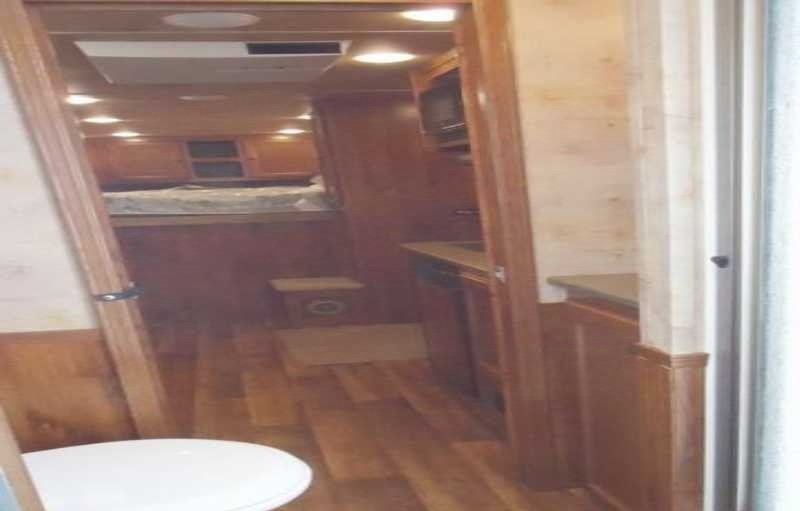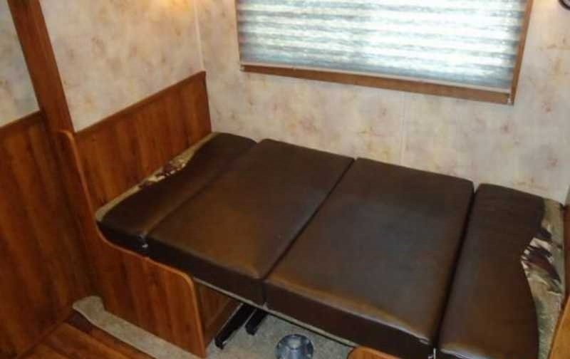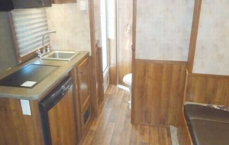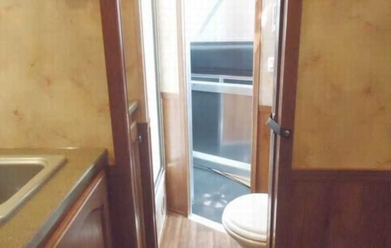 The living quarters include a 9’ shortwall and 14’ longwall with a walk through door to the horse area. The kitchen is equipped with a refrigerator, cooktop and microwave. The living area features air conditioning, a radio and antenna. The bathroom includes a toilet, shower and plumbing system with fresh, gray and black water holding tanks, plus a water heater. Power is provided via LP tanks, battery and wiring for 110v power.