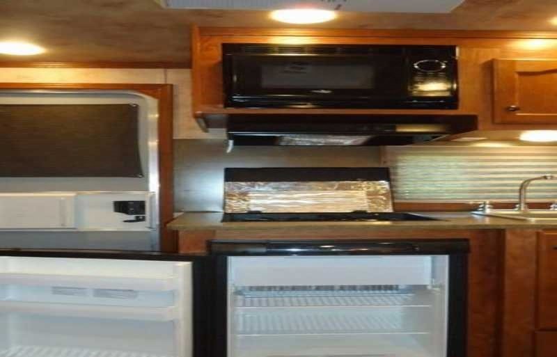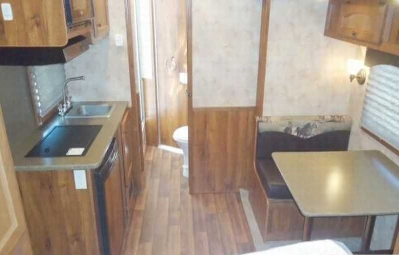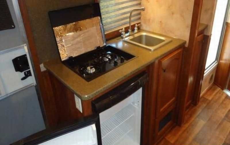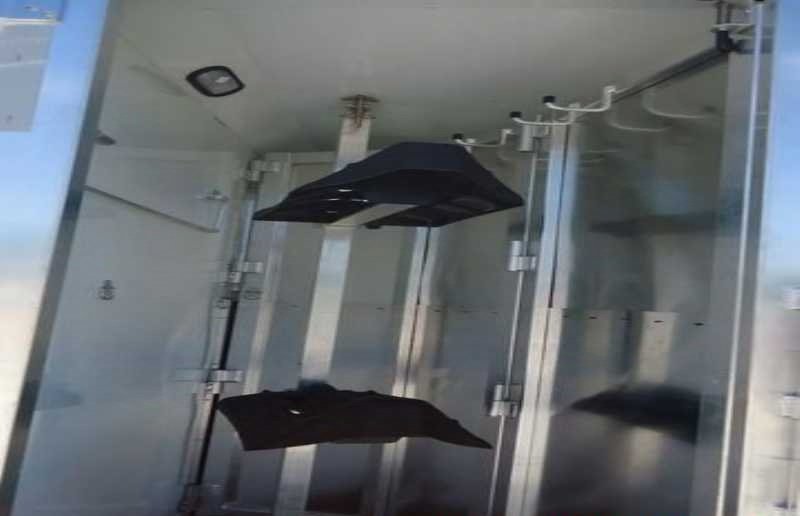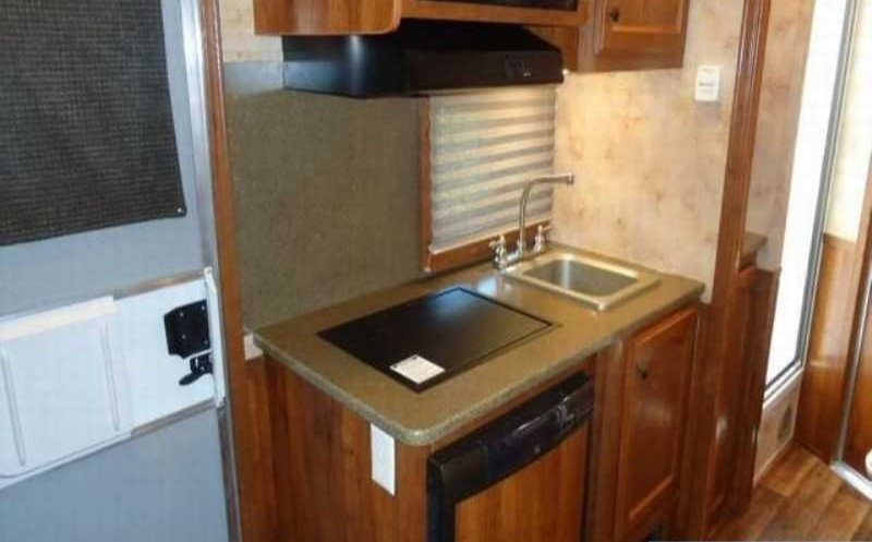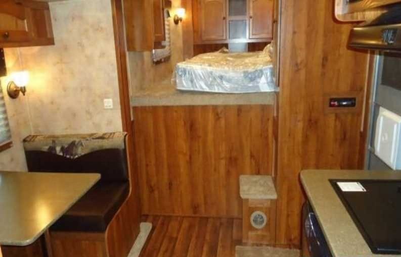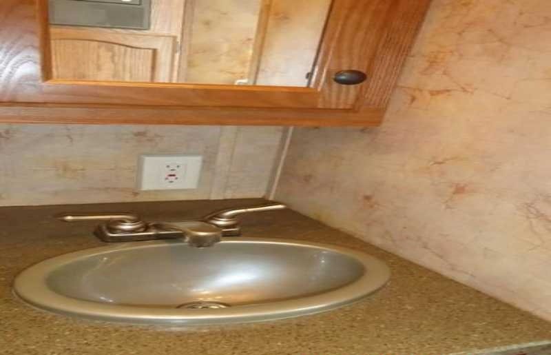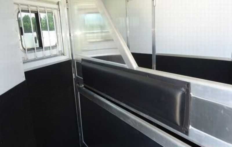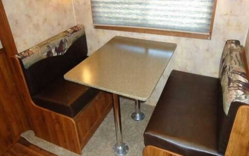 The living quarters include a 9’ shortwall and 14’ longwall with a walk through door to the horse area. The kitchen is equipped with a refrigerator, cooktop and microwave. The living area features air conditioning, a radio and antenna. The bathroom includes a toilet, shower and plumbing system with fresh, gray and black water holding tanks, plus a water heater. Power is provided via LP tanks, battery and wiring for 110v power.