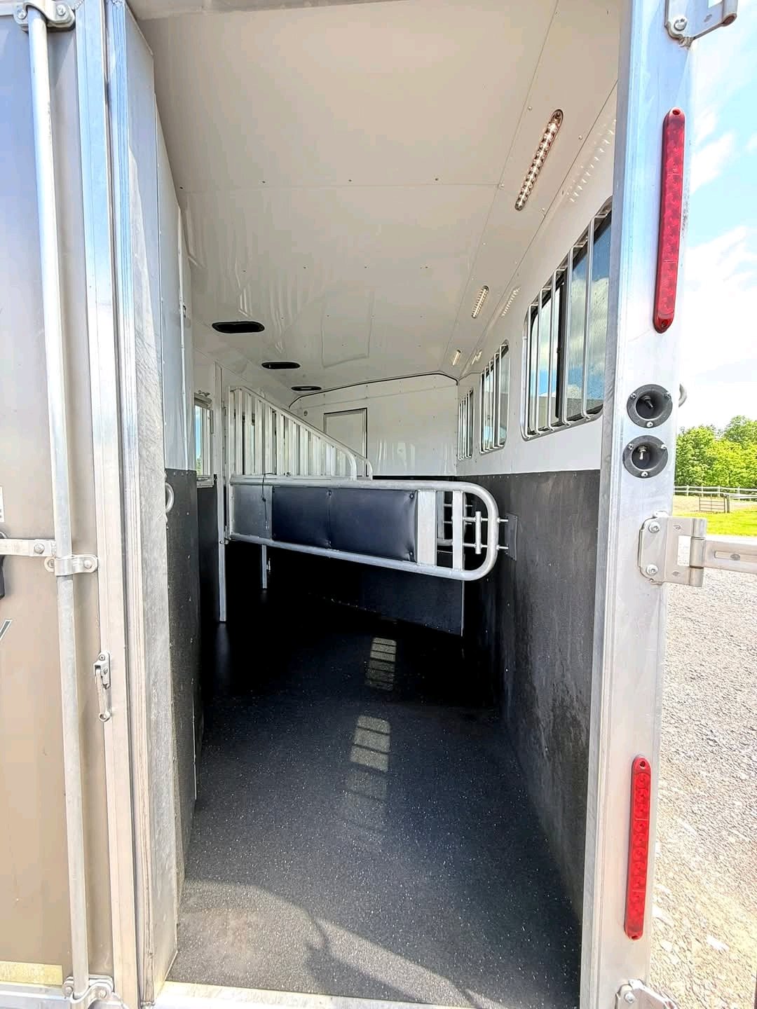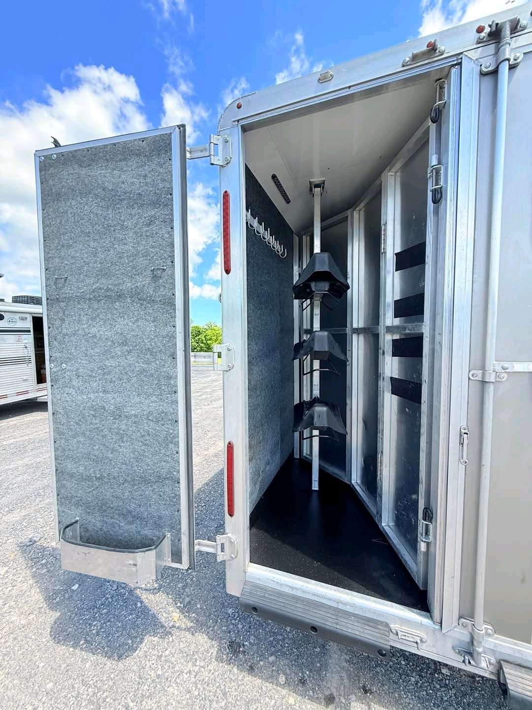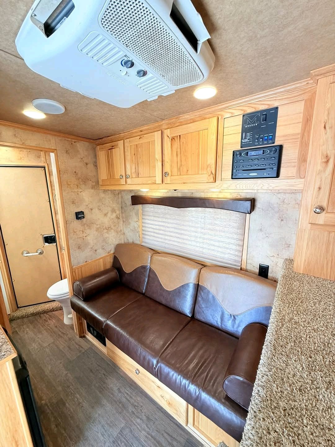The horse area is thoughtfully designed with drop down windows at the head side, sliders on the rump side, interior and loading lights, a 3 tier saddle rack, bridle hooks, rubber mat flooring, escape door at the first stall and a walk through door to the living quarters. Riding on newer 14 ply G range tires, this trailer is ready for many miles ahead.