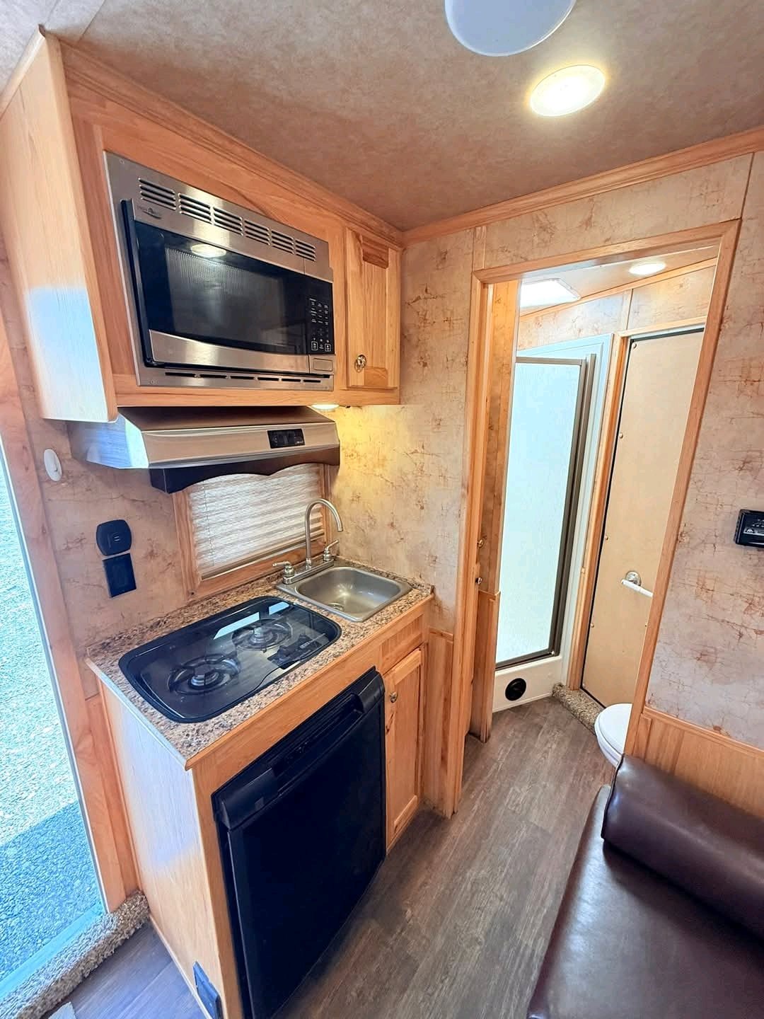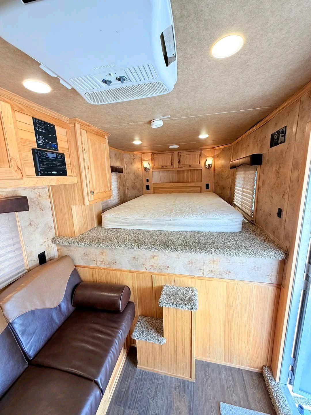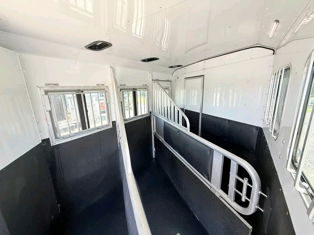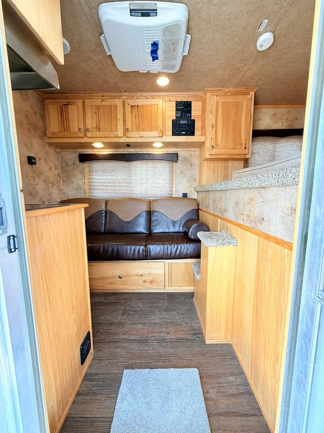 The horse area is thoughtfully designed with drop down windows at the head side, sliders on the rump side, interior and loading lights, a 3 tier saddle rack, bridle hooks, rubber mat flooring, escape door at the first stall and a walk through door to the living quarters. Riding on newer 14 ply G range tires, this trailer is ready for many miles ahead.