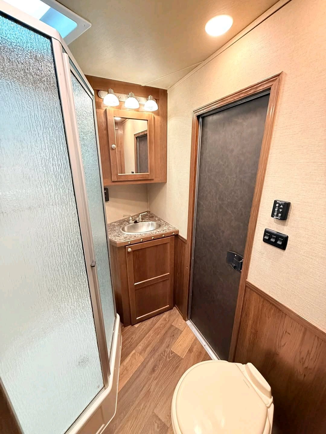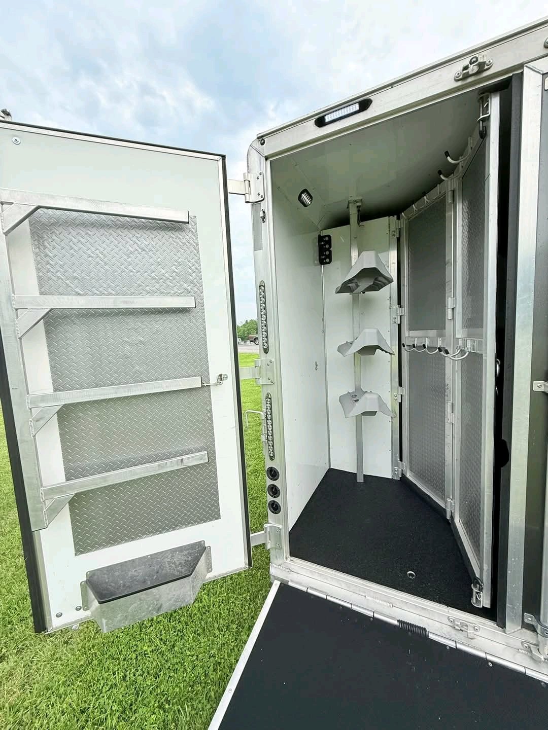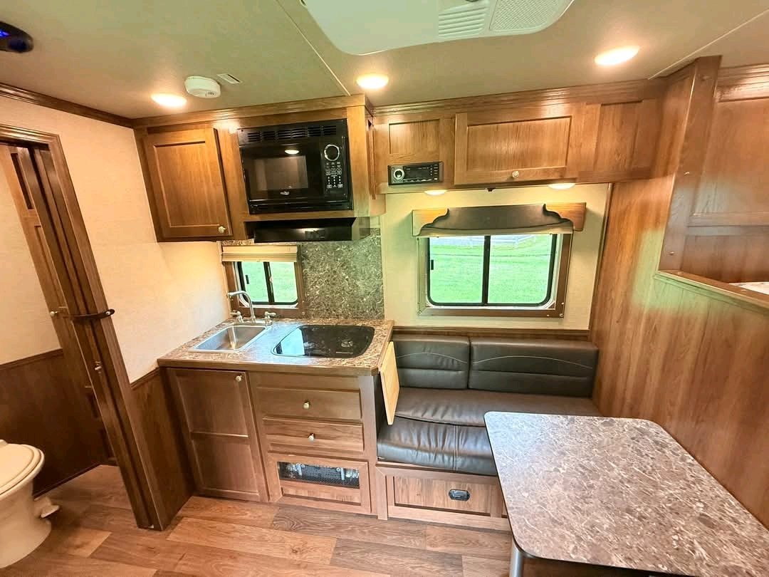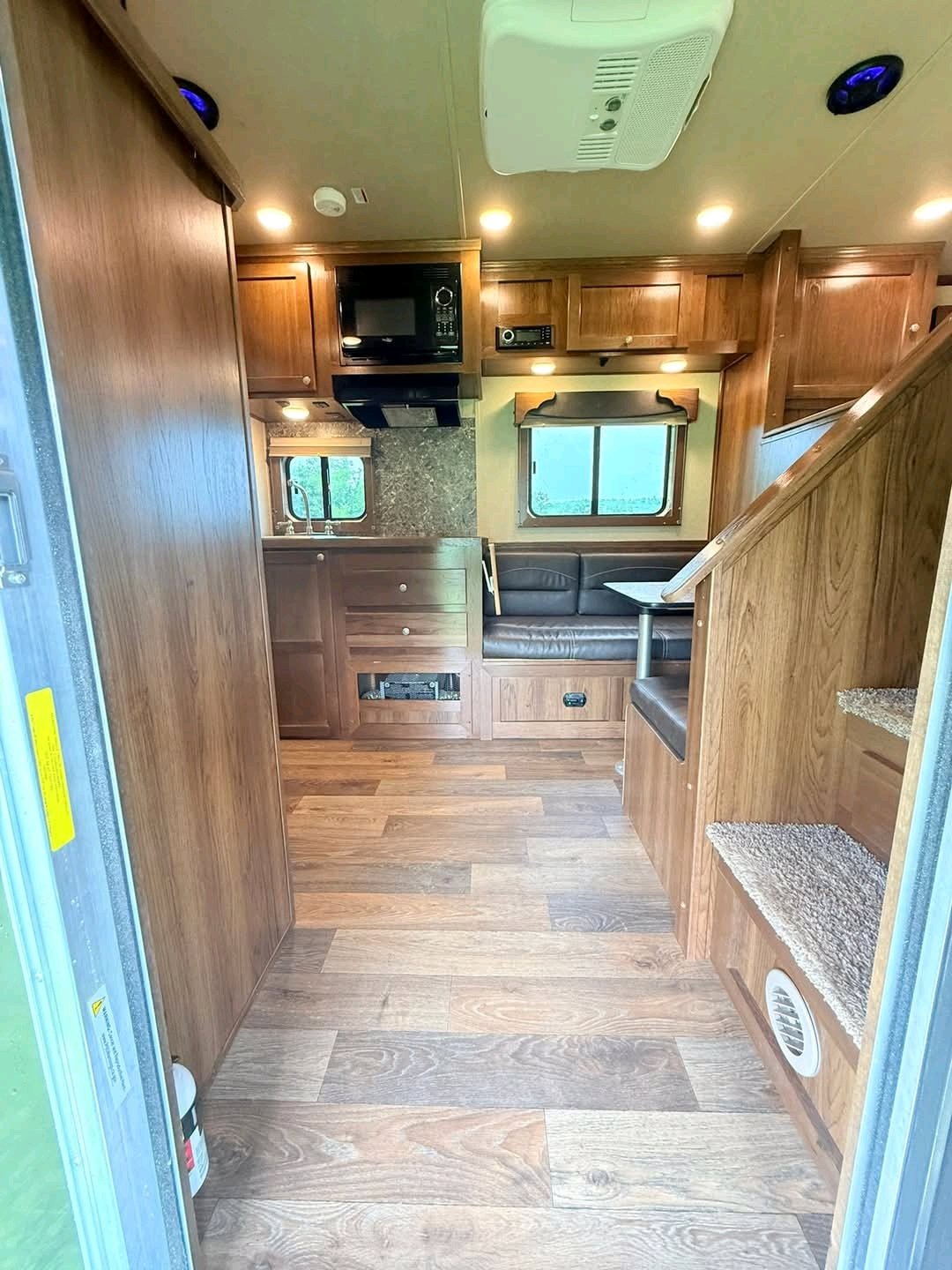Inside, the well designed living quarters feature a dinette that folds down for extra sleeping space, a single sink, a large 6’ refrigerator, double burner recessed cooktop, microwave, and plenty of storage cabinets. You’ll also find a flat screen TV, stereo system with interior and exterior speakers, power awning, air conditioning and furnace, a full bathroom with shower, sink, toilet, and wardrobe closet. A walk through door connects directly to the horse area for added convenience.