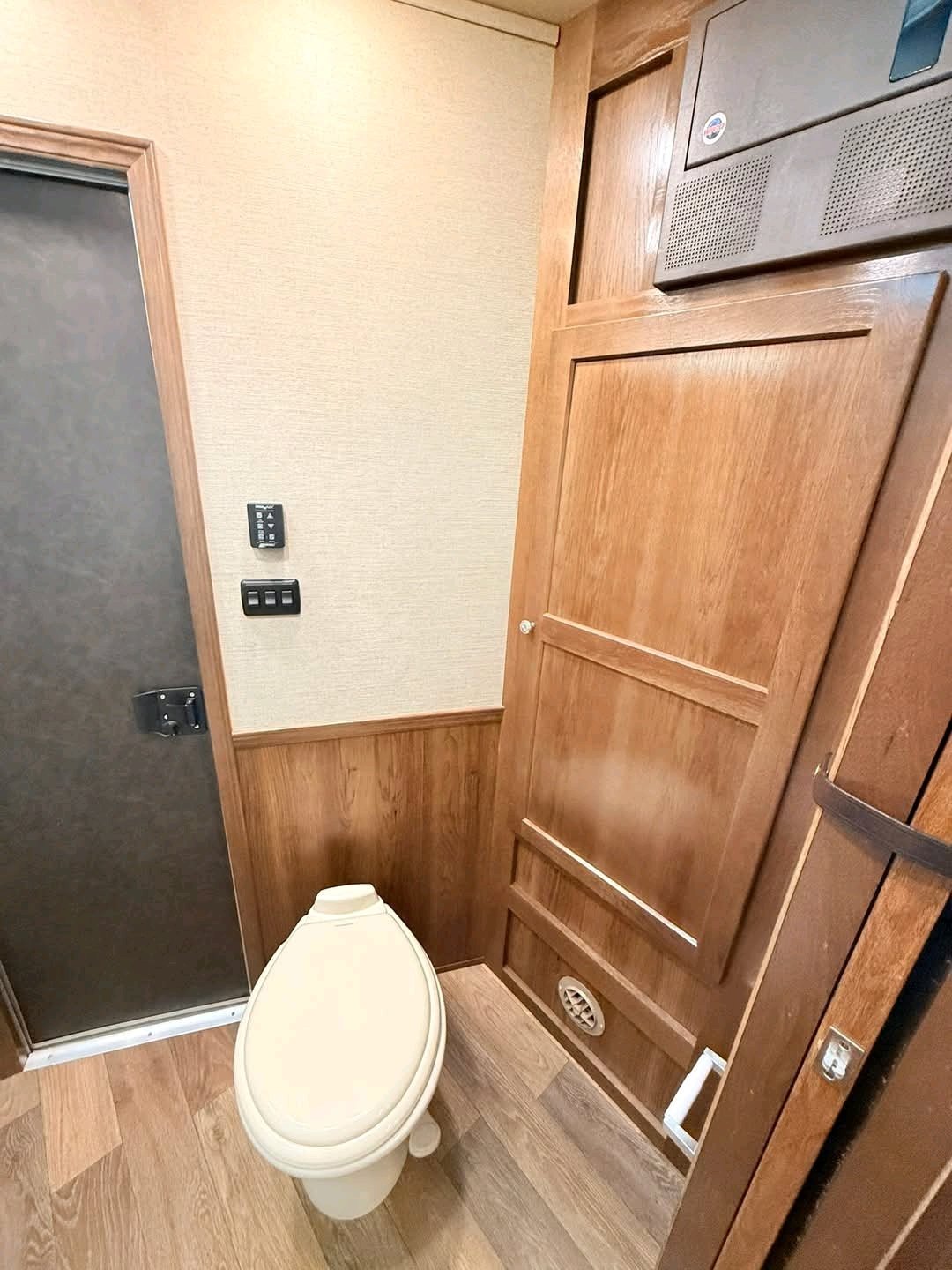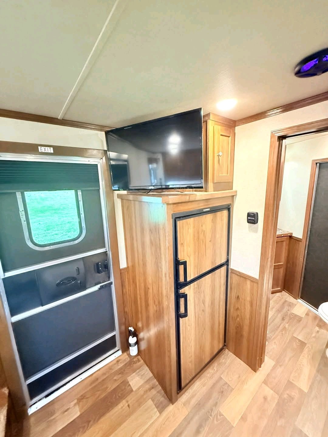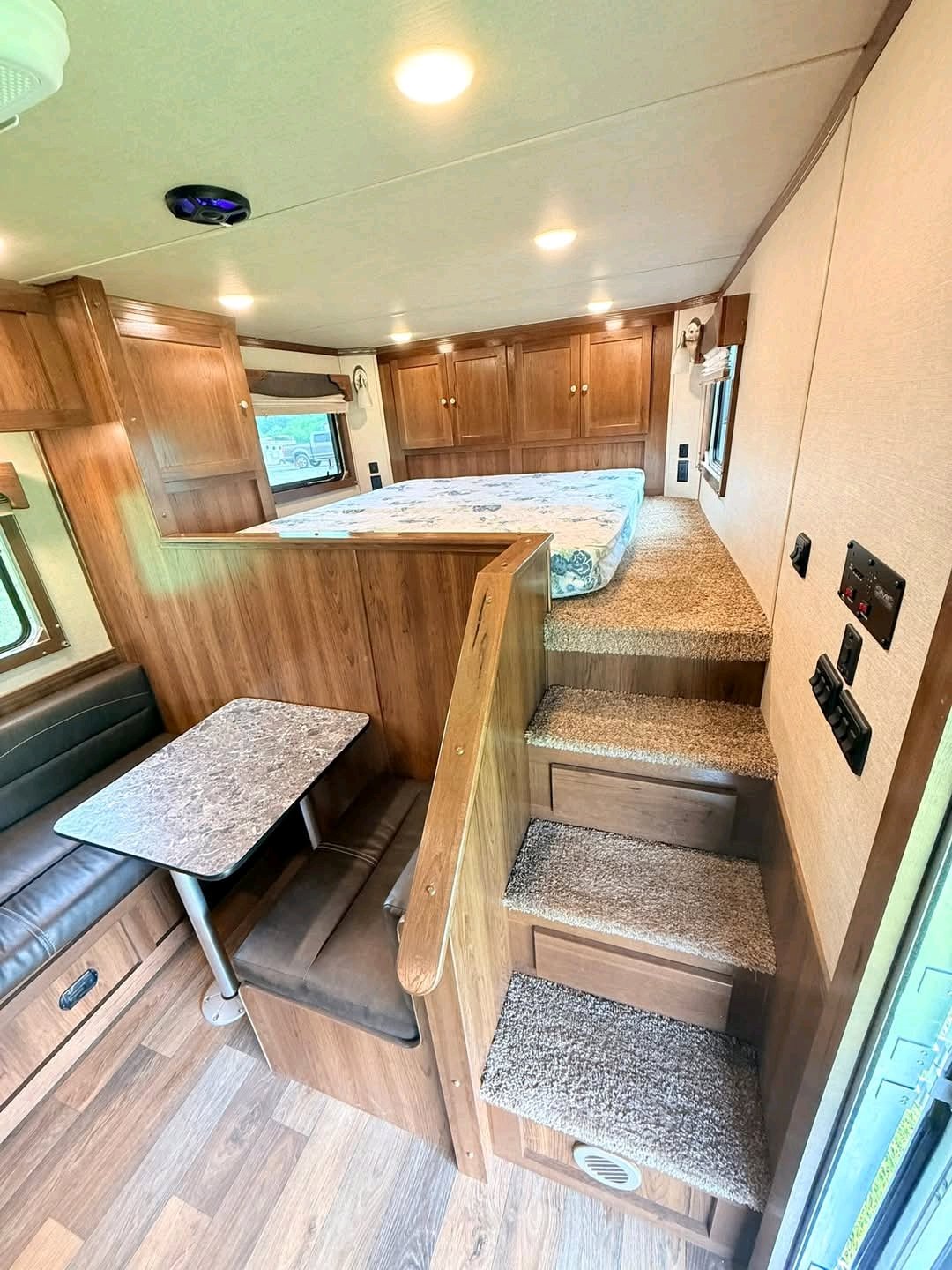 Inside, the well designed living quarters feature a dinette that folds down for extra sleeping space, a single sink, a large 6’ refrigerator, double burner recessed cooktop, microwave, and plenty of storage cabinets. You’ll also find a flat screen TV, stereo system with interior and exterior speakers, power awning, air conditioning and furnace, a full bathroom with shower, sink, toilet, and wardrobe closet. A walk through door connects directly to the horse area for added convenience.