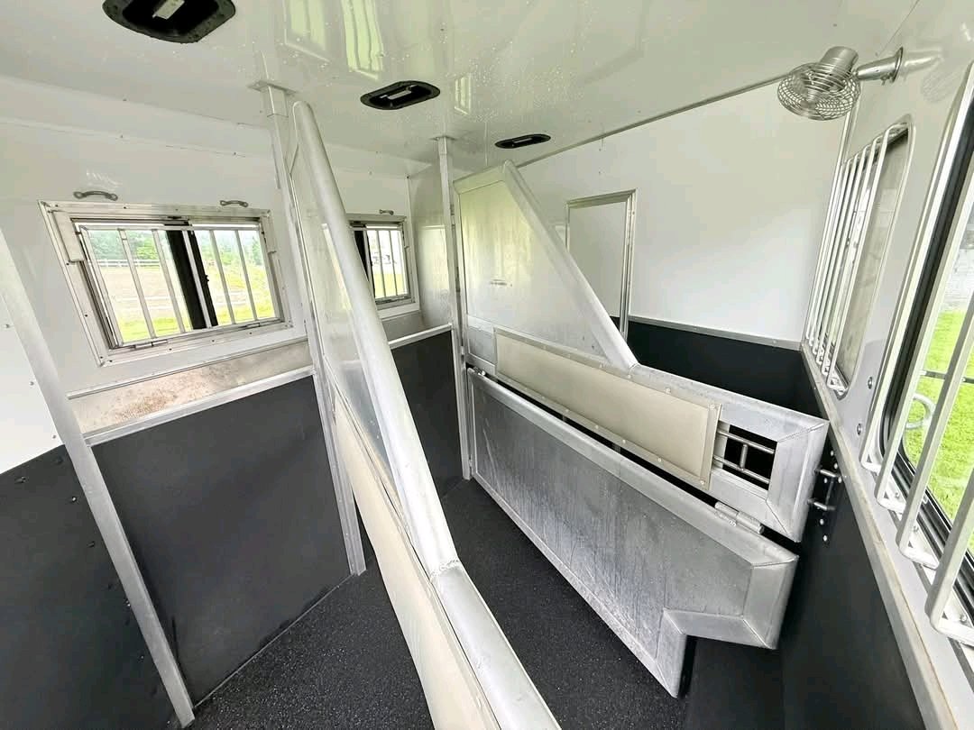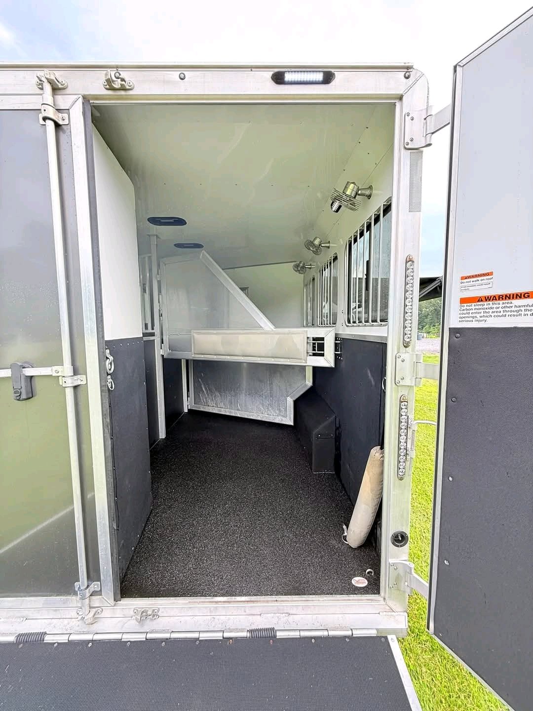 In the rear, the trailer includes a 3 tier saddle rack, blanket bar, brush box, and bridle hooks in the tack area. The upgraded WERM flooring provides durability and easy maintenance. LED lighting is installed throughout, including the tack area, load lights and side markers. Each horse stall features a fan, with drop down head windows and sliding windows at the rear. Padded dividers, a stud wall at the first stall, escape door, and mangers with under storage on stalls 2 and 3 round out the horse area. The rear ramp makes loading simple and it can be removed if preferred.