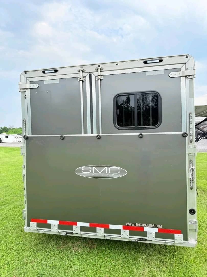 This 2021 SMC Laramie is a beautifully maintained all aluminum 3 horse trailer with a 9’ living quarters perfect for comfort and convenience on the road. It’s equipped with 7K axles, newer 10 ply E range tires and upgraded aluminum wheels. We’ve also added a single leg hydraulic jack for easy hookup and leveling.