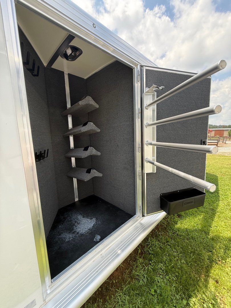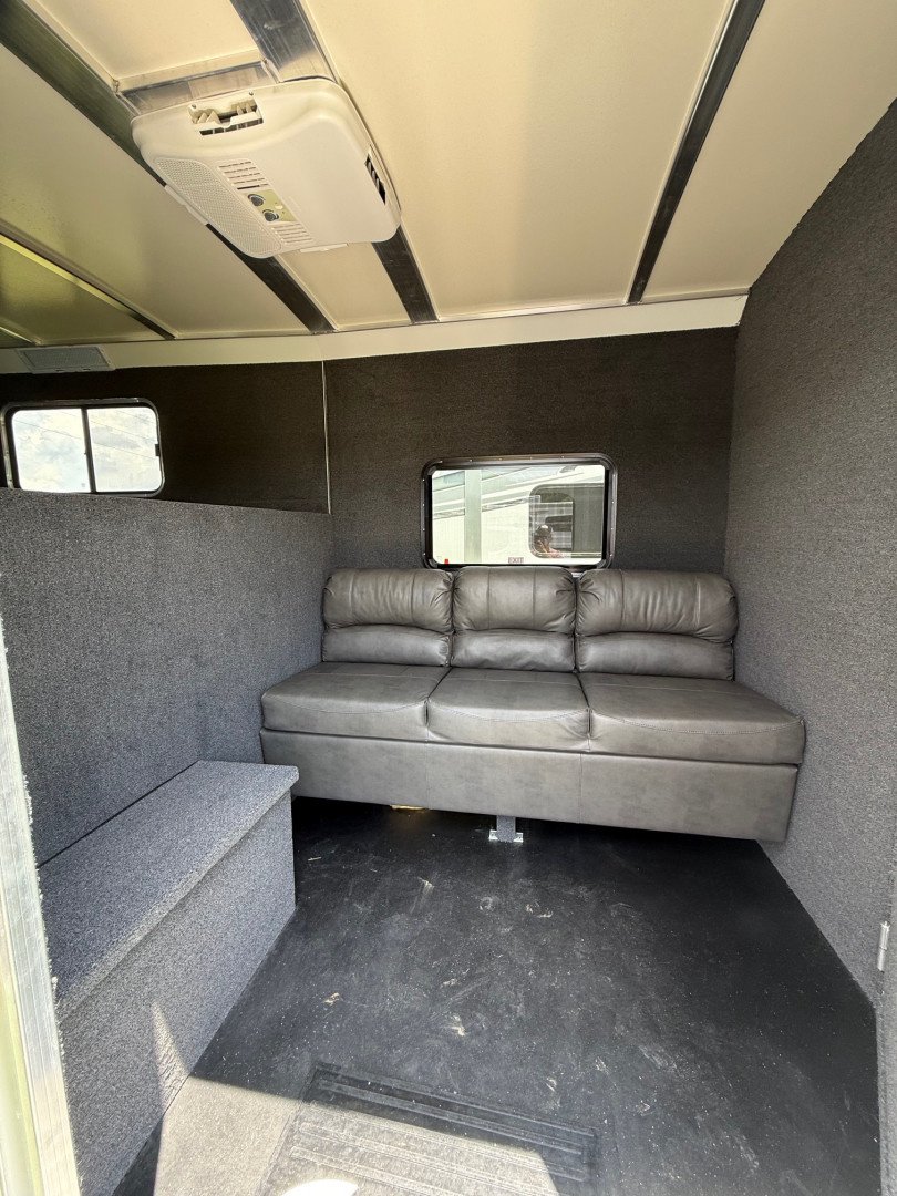 The front tack area is equipped with the Comfort Package, which includes a 13.5 BTU air conditioner, 75” fold down black couch, full height cabinet with paddle latch, 110V 30 AMP package with converter, shore cord and inlet, plus a 110V outlet inside the cabinet. The tack area also includes 4 saddle racks, 12 hooks, a brush tray and a fold up step at the tack door.