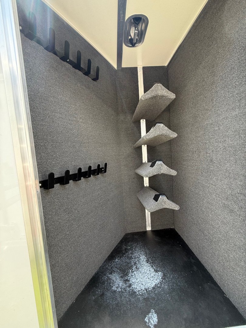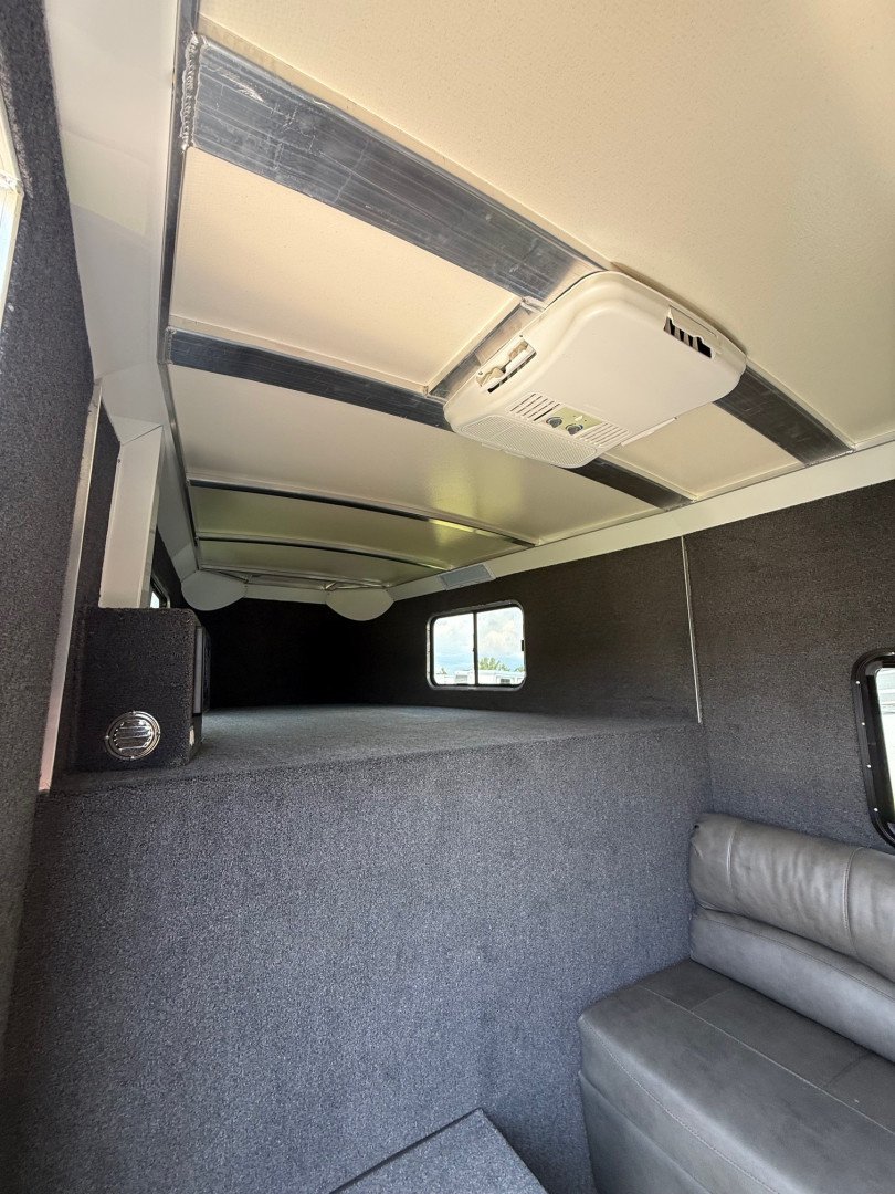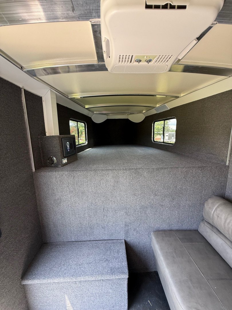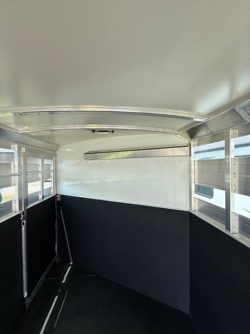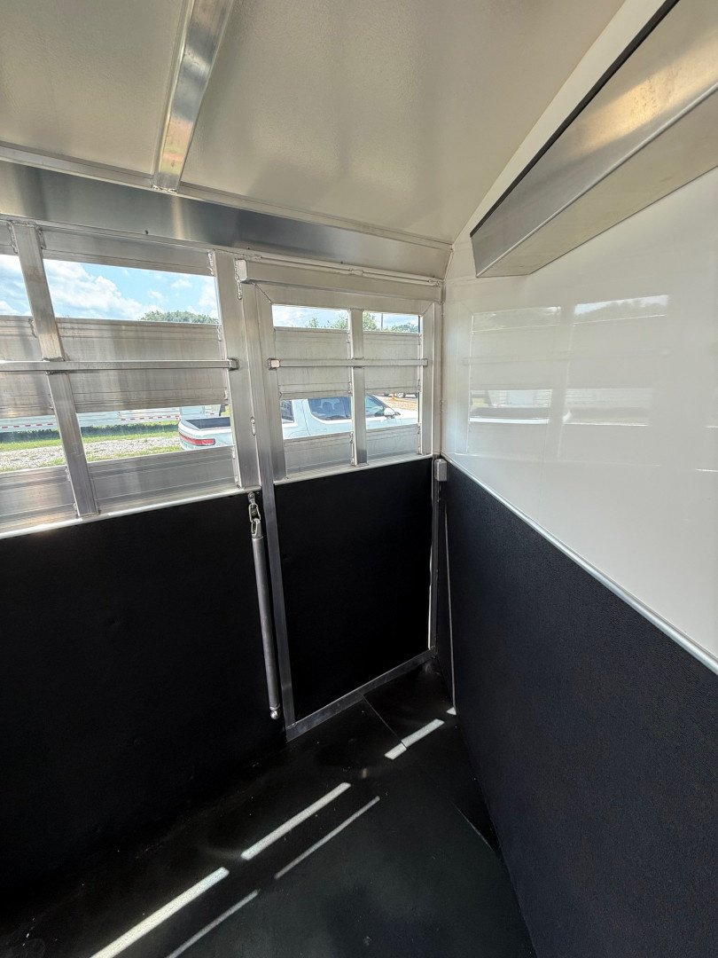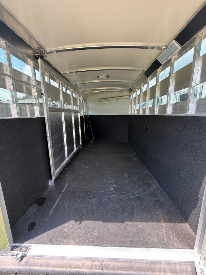 The stock area features 16’ of stock space divided by a center gate into two 8’ box stalls, full size escape doors, insulated ceiling, heavy duty rubber mats, tie rails and sliding windows for airflow. The trailer includes stock sides with open air gaps, a swinging center gate, carpeted riser wall and nose, bridle hooks and a full swing rear gate for easy loading and unloading.